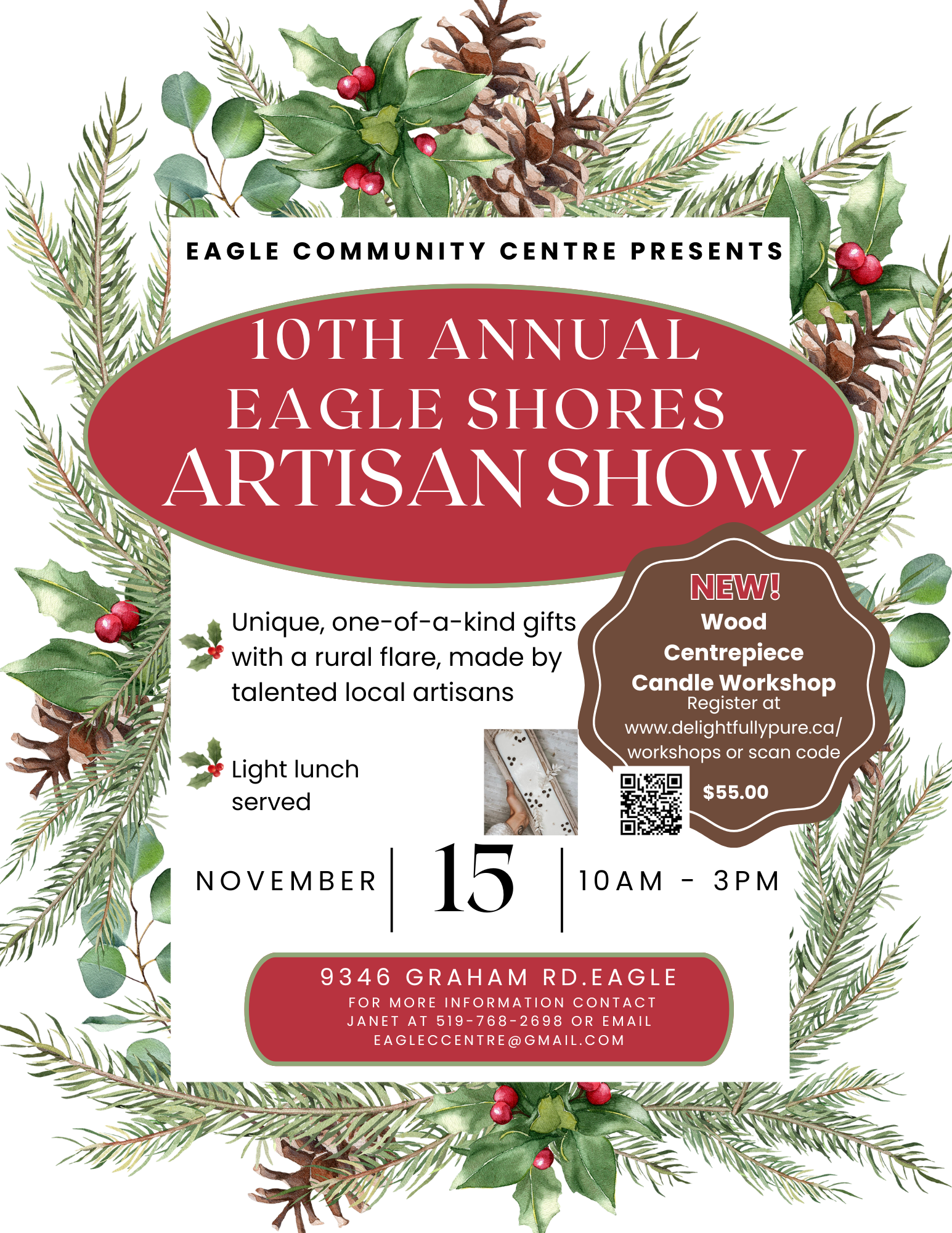 The Eagle Community Centre located at 9346 Graham Road is excited to host its' 10th Annual Eagle Shores Artisan Show on Saturday, November 15th from 10 am to 3 pm. Unique one of a kind gifts with a rural flare, made by talented artisans. New products featuring textiles, wood, honey, soaps, fresh baking, art decor and so much more. NEW! Wood centrepiece Candle Workshop. Register at www.delightfullypure.ca/workshops.